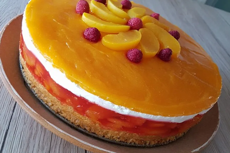600 ml Sahne mit 3 Sahnesteif und 3 Vanillinzucker steif schlagen und auf der Mandarinenmasse verteilen. 3 Pck. Vanillesauce mit dem Multivitaminsaft verrühren und auf die Sahne gießen. Den Kuchen bis zum Verzehr kalt stellen.