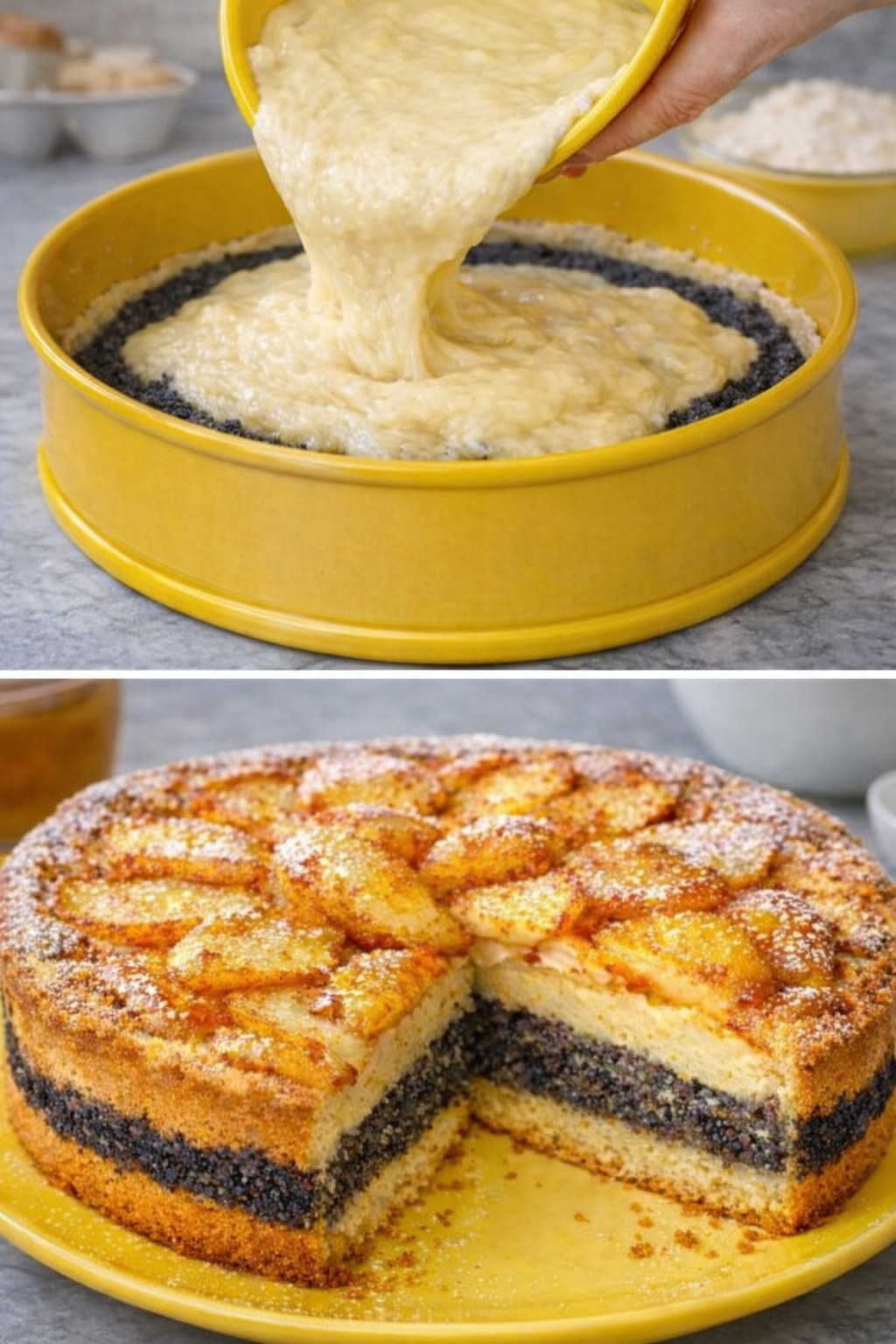 Ein himmlischer Apfel-Mohn-Kuchen mit cremiger Vanillefüllung – saftig, aromatisch und unwiderstehlich lecker.