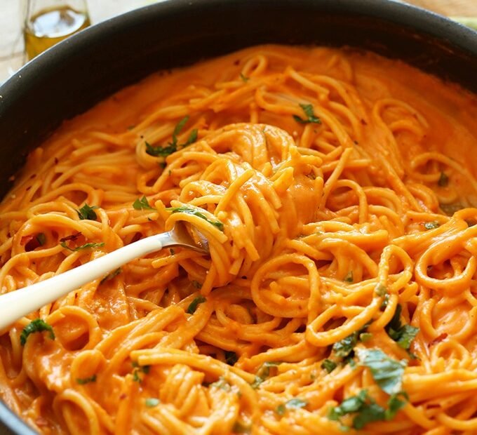 Zutaten für 2 Personen 2 große rote Paprika 2 Schalotten 4 Knoblauchzehen 250g Spaghetti oder Linguine 2 TL Speisestärke 1 TL Paprikapulver 3 EL feinstes Olivenöl 1 Becher (200 ml) Sahne 3 Stengel frische glatte…