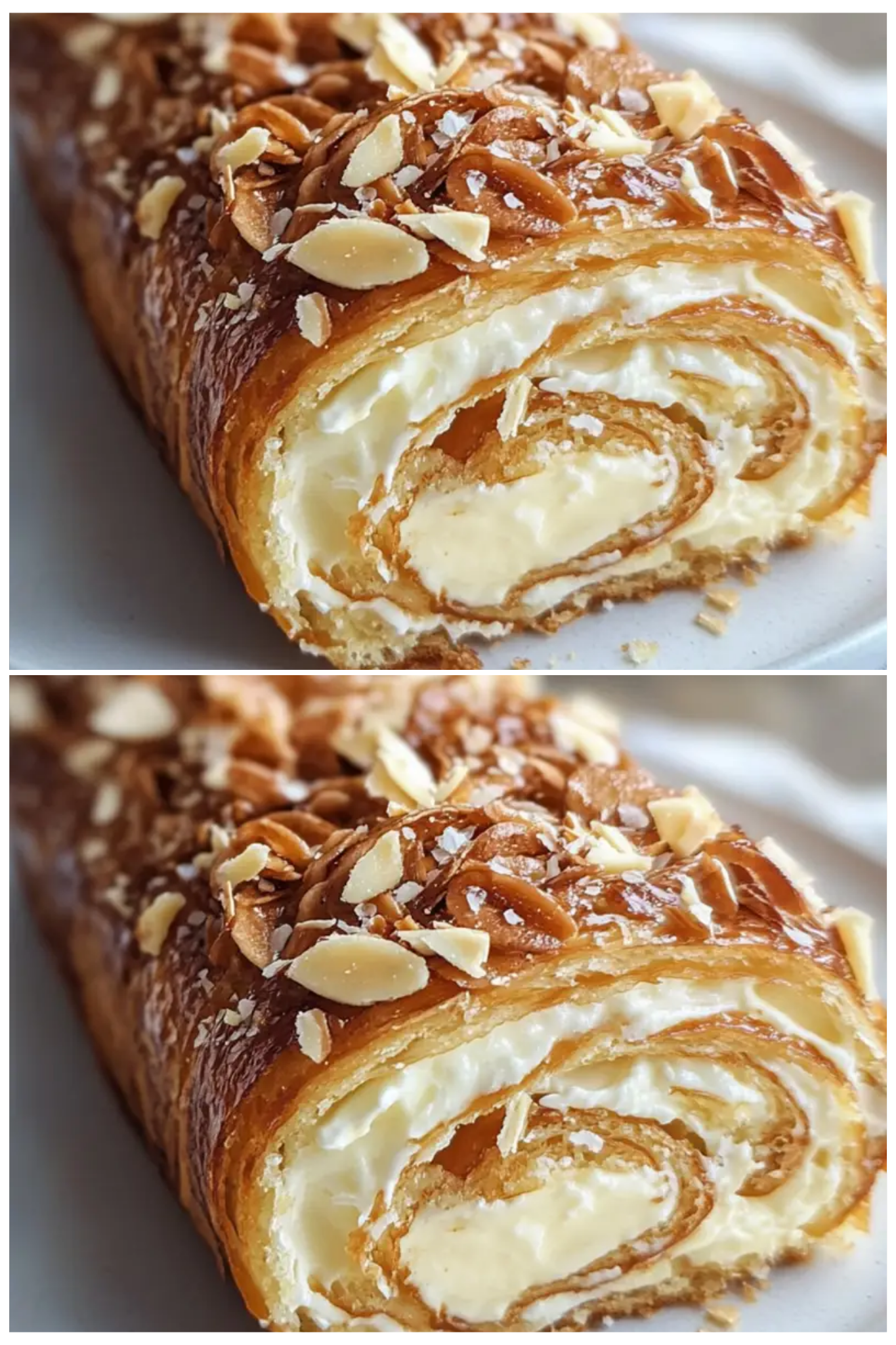 4️⃣ Füllen: Biskuit ausrollen, 2/3 der Creme einfüllen, wieder zusammenrollen und die restliche Creme außen verteilen. Mandel-Topping darauf streuen.
