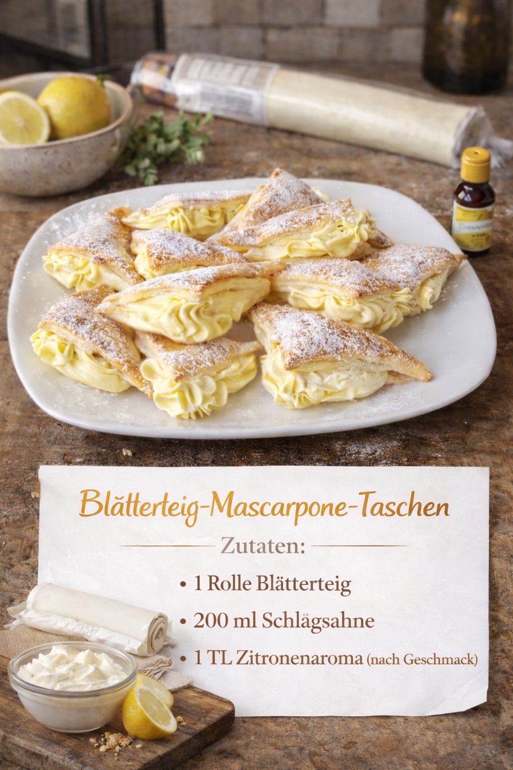 Den Blätterteig ausrollen, in Quadrate schneiden und leicht mit Milch bestreichen. Die Quadrate zu Dreiecken falten, auf das Blech legen, erneut mit Milch bestreichen und mit Vanillezucker bestreuen.