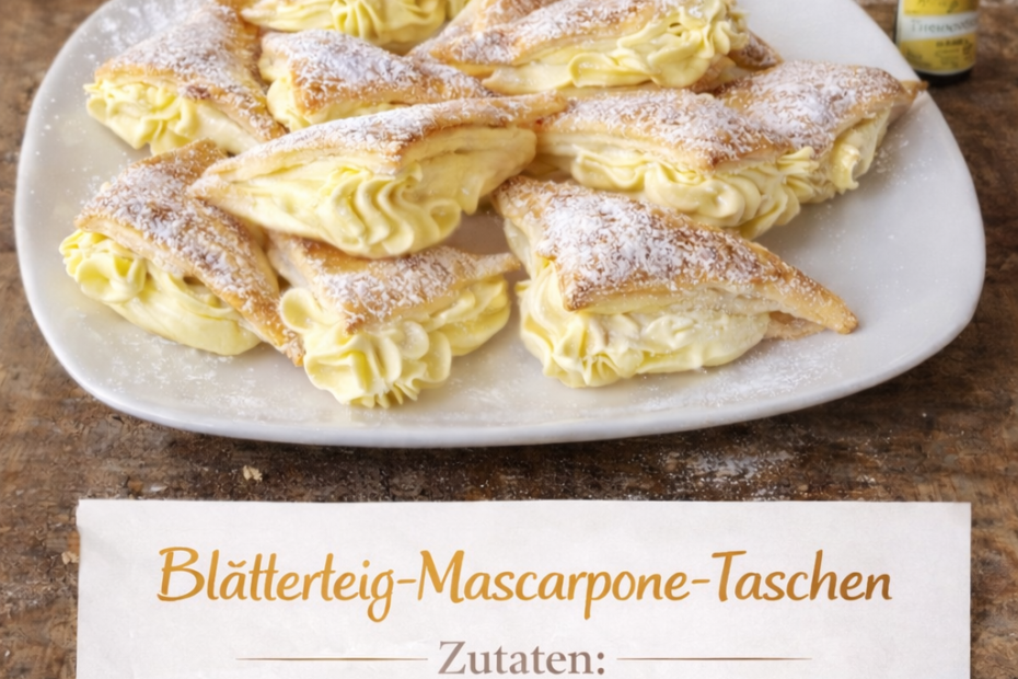 Den Blätterteig ausrollen, in Quadrate schneiden und leicht mit Milch bestreichen. Die Quadrate zu Dreiecken falten, auf das Blech legen, erneut mit Milch bestreichen und mit Vanillezucker bestreuen.