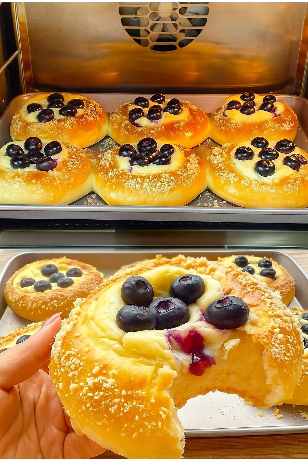 Mit der Quarkcreme füllen, Blaubeeren darauflegen und mit Zucker oder Streuseln bestreuen.