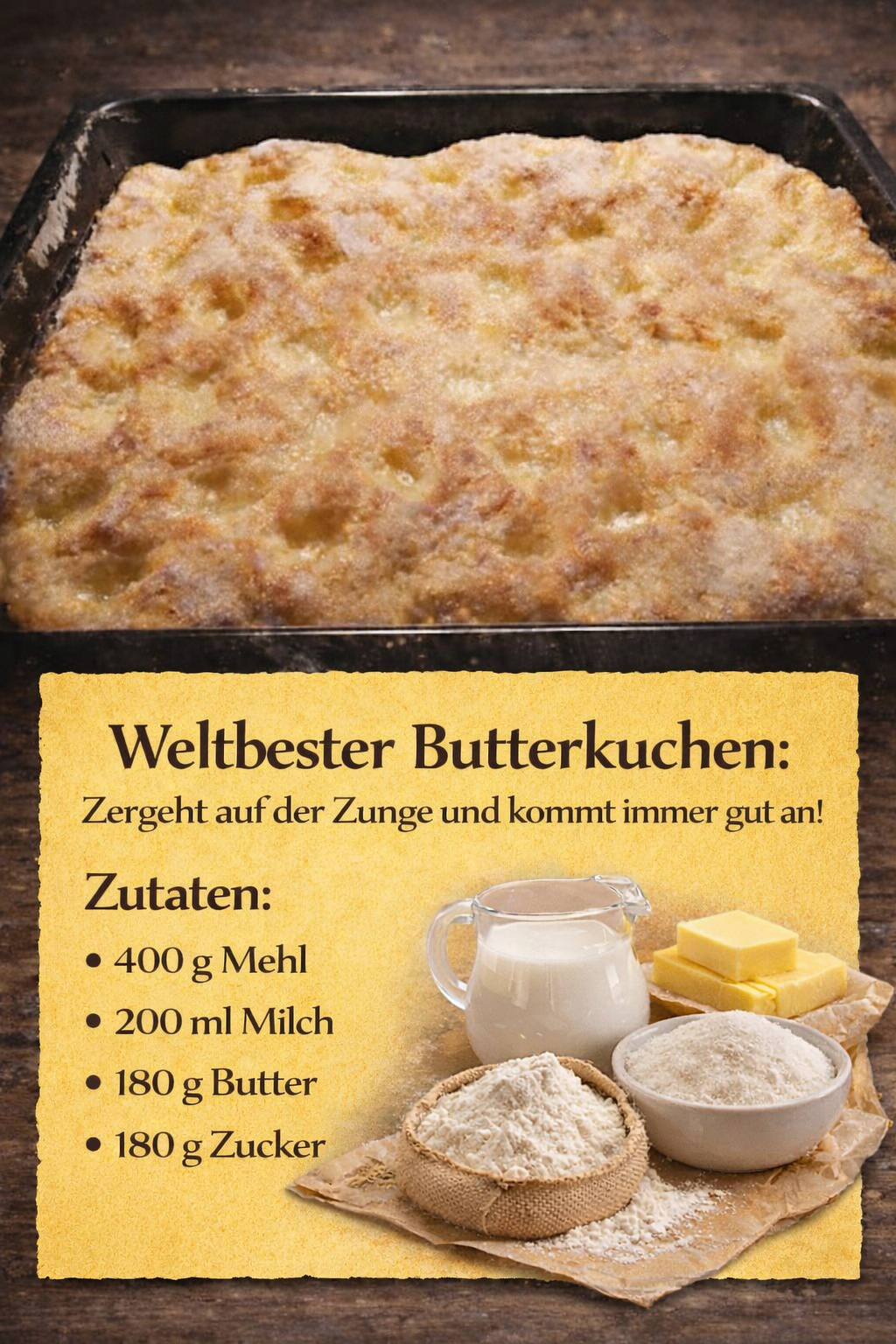 Dieser Butterkuchen ist ein echter Klassiker, der seit Generationen begeistert. Schon beim ersten Bissen merkt man sofort, warum er „weltbester“ genannt wird: unglaublich saftig, herrlich weich und mit einer goldenen, leicht knusprigen Oberfläche, die einfach süchtig macht.