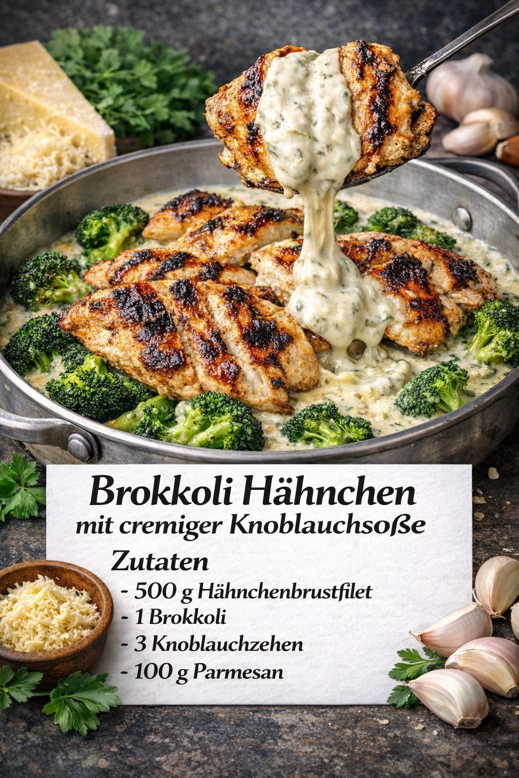 Hähnchen und Brokkoli in die Pfanne zur Soße geben und alles gut vermengen. Kurz erhitzen, damit alles schön warm ist.