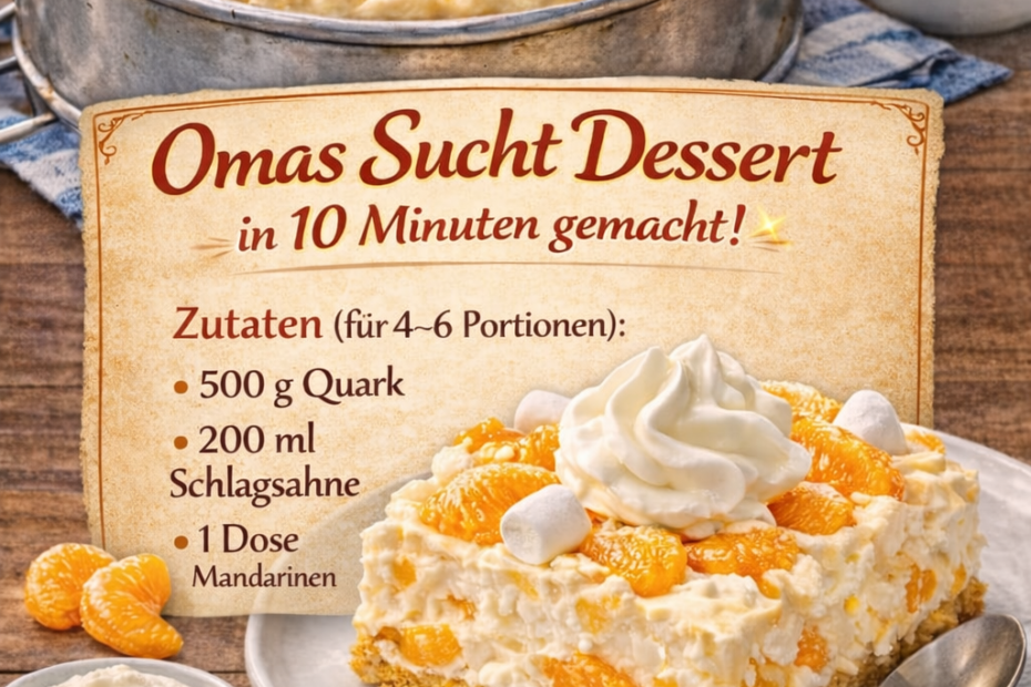 Zutaten: 500 g Quark (Magerquark oder nach Geschmack) 200 ml Schlagsahne 1 Dose Mandarinen (abgetropft) 1 Päckchen Vanillezucker 2–3 EL Zucker (nach Geschmack) 1 Päckchen Butterkekse oder Löffelbiskuits Optional: etwas Zitronenabrieb oder ein Schuss Orangensaft… Omas Dessert