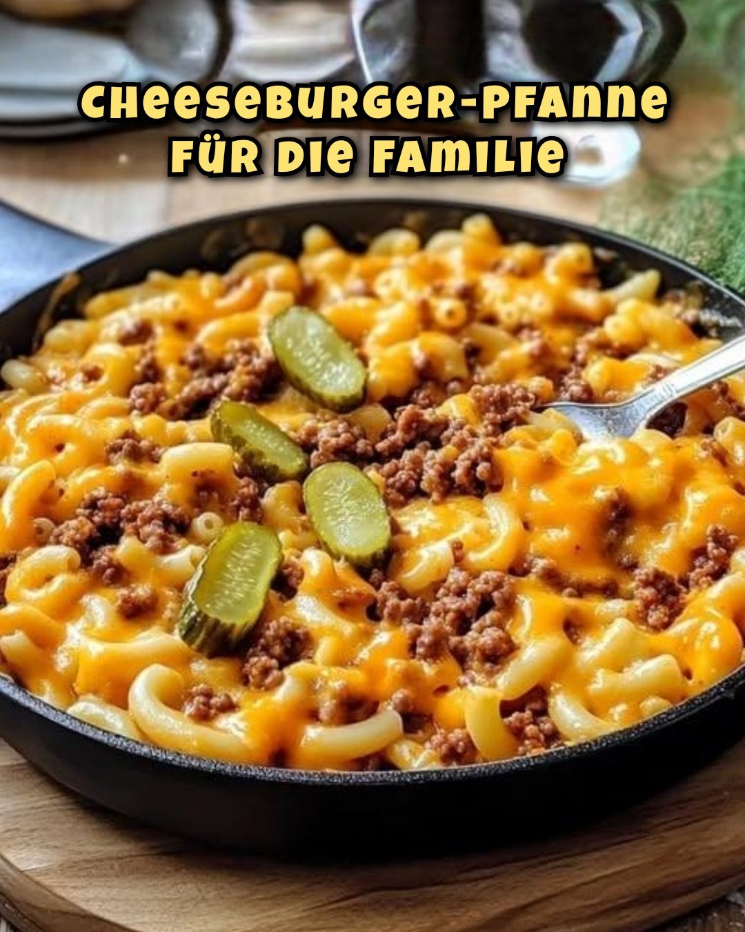 Cheeseburger-Pfanne mit Gewürzgurken bestreuen und servieren.