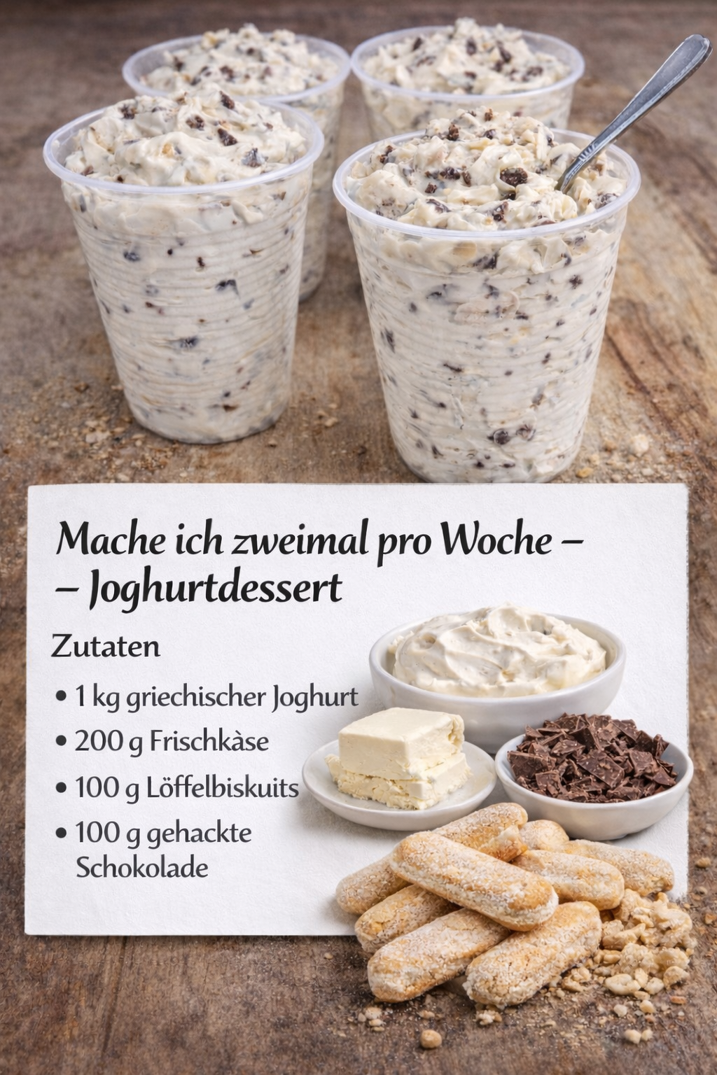 Biskuitbrösel und Schokolade unter die Joghurtcreme mischen, bis alles gut verteilt ist.