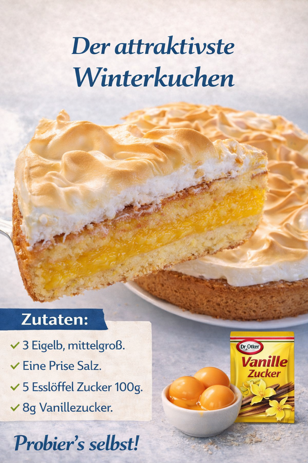 Den Kuchen nochmals für 10–15 Minuten in den Ofen schieben, bis das Baiser leicht goldgelb ist.