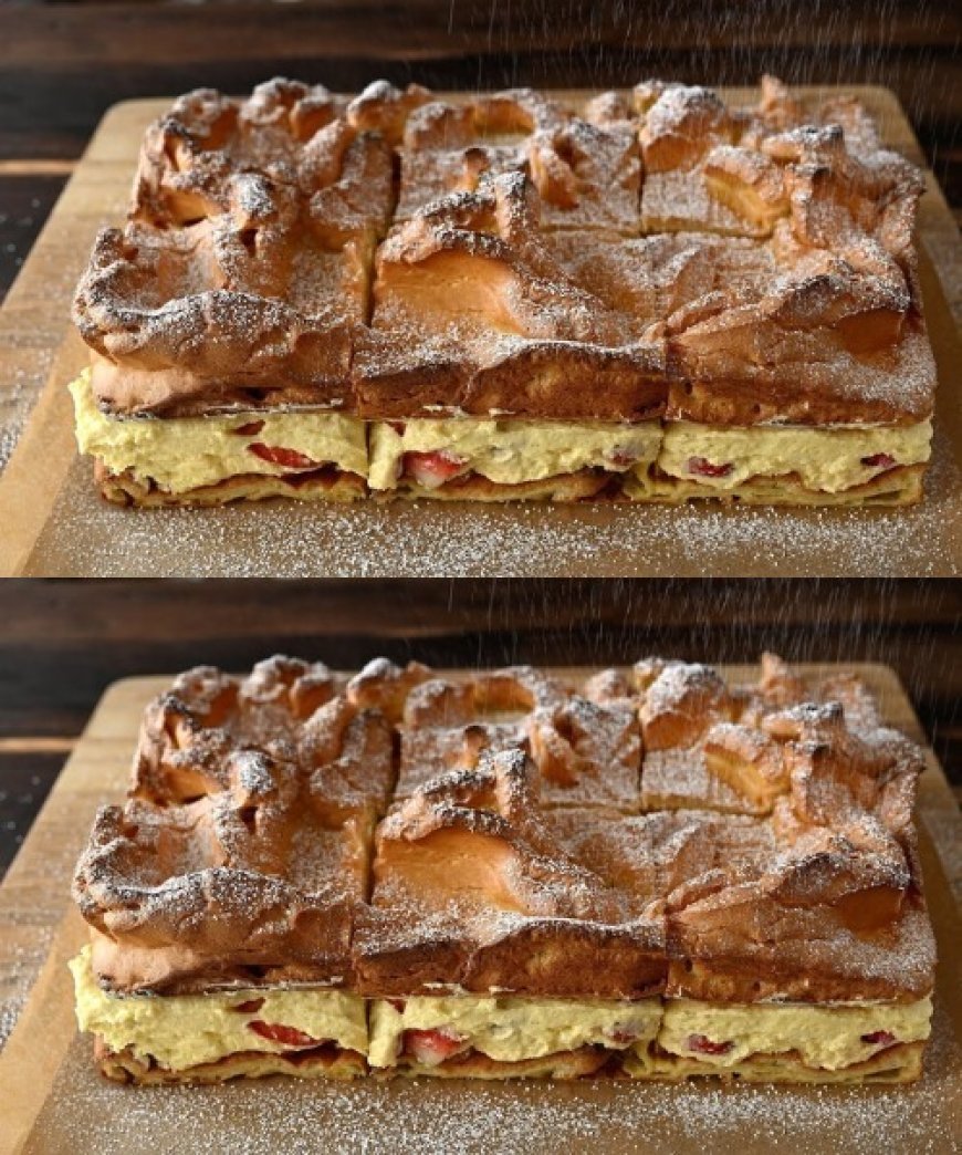 Mit den restlichen Erdbeeren verzieren und mit Puderzucker bestreuen.