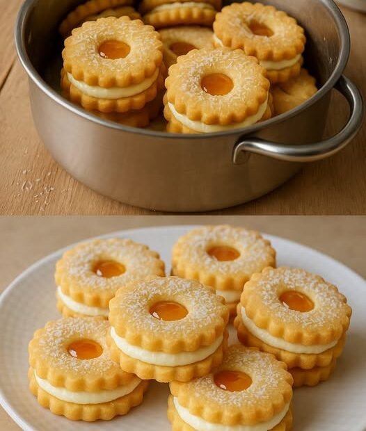 Runde Kekse ausstechen, bei der Hälfte ein Loch in der Mitte ausstechen.