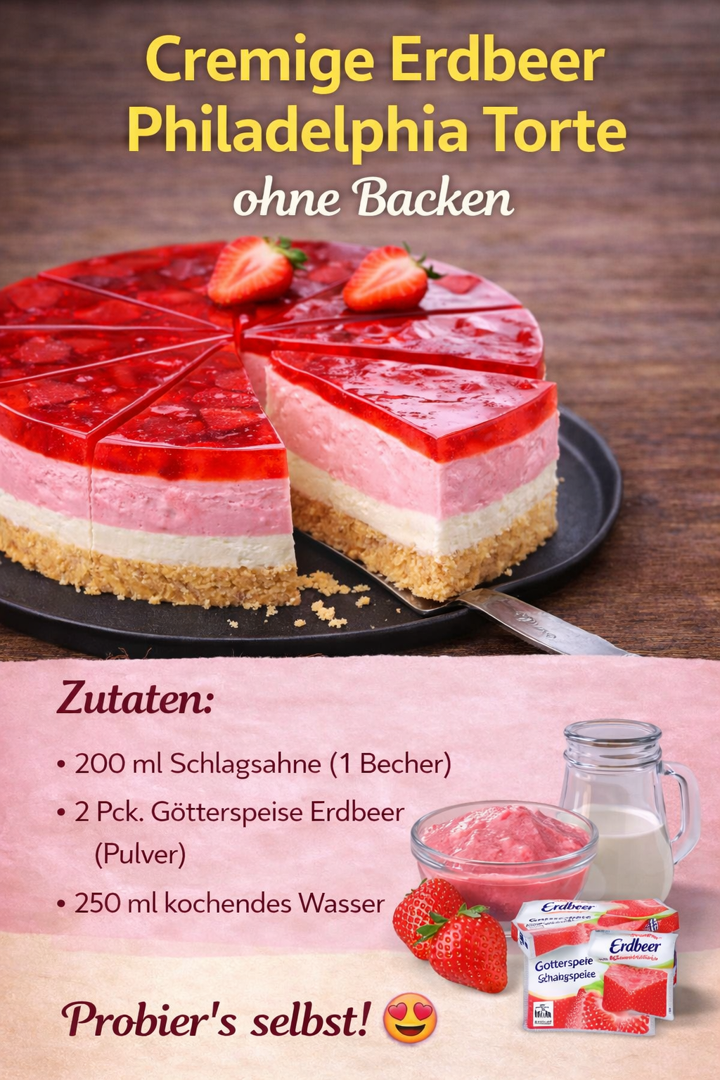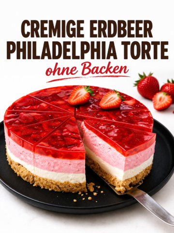 Manchmal braucht es kein Backen, keine komplizierten Schritte und keine langen Wartezeiten, um einen wirklich beeindruckenden Kuchen zu zaubern. Diese cremige Erdbeer Philadelphia Torte ist genau so ein Rezept – einfach, schnell und unglaublich lecker. Schon beim ersten Blick auf die fruchtige, glänzende Erdbeerschicht bekommt man Lust auf mehr, und nach dem ersten Bissen ist es endgültig vorbei… du wirst sie lieben!