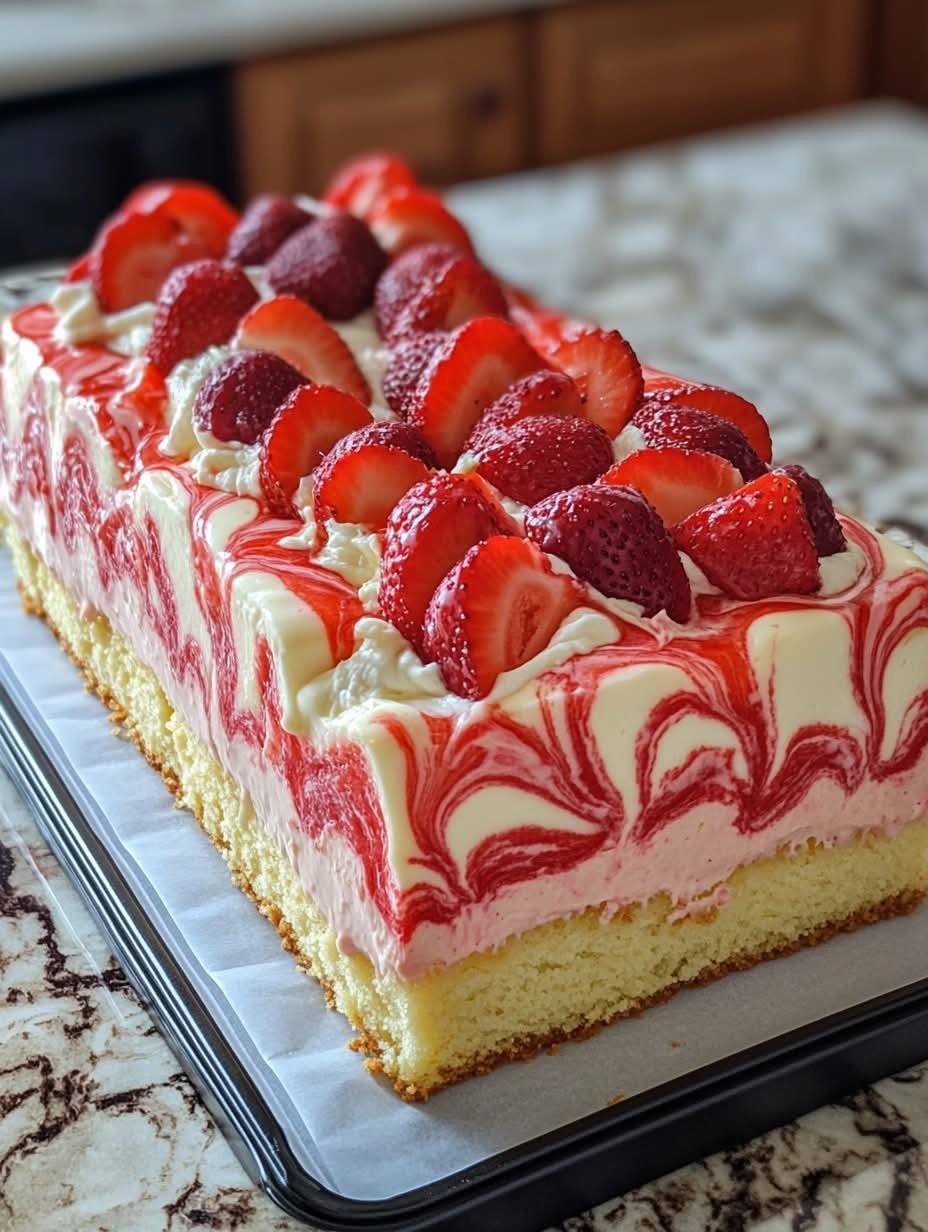 Erdbeerpüree in Klecksen daraufgeben und mit einem Holzstäbchen marmorieren.