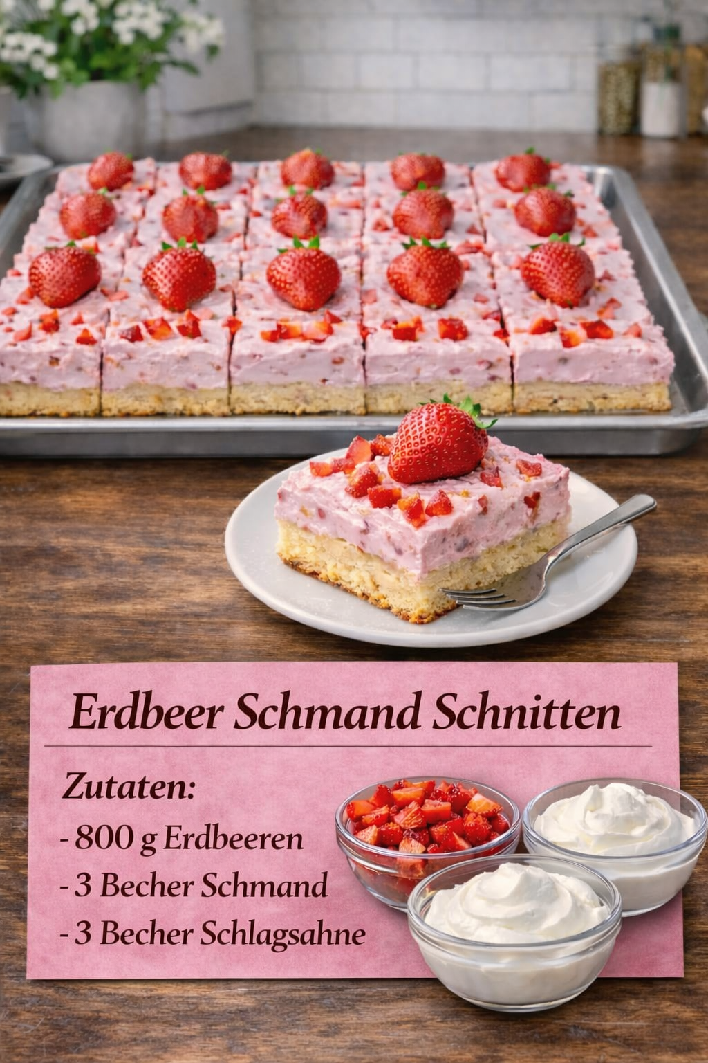 In gleichmäßige Schnitten schneiden und nach Wunsch mit frischen Erdbeeren garnieren.