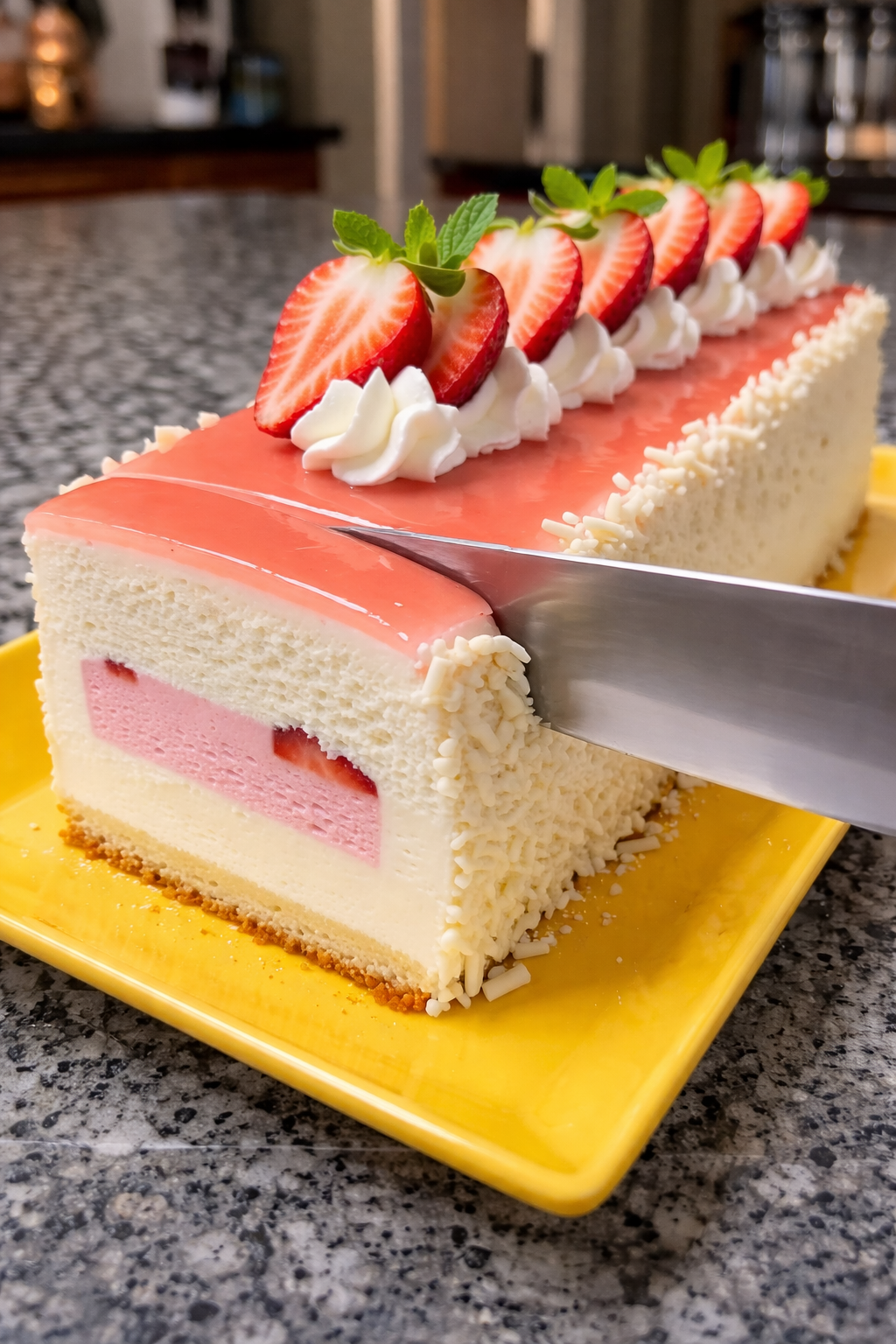 Diese Erdbeer Vanilla Cream Mousse Cake ist ein echter Traum für alle Dessert-Liebhaber. Ein lockerer Kuchenboden, eine fruchtige Erdbeerfüllung, luftige Vanillecreme und ein glänzender Erdbeer-Spiegel machen diese Torte zu einem besonderen Highlight.