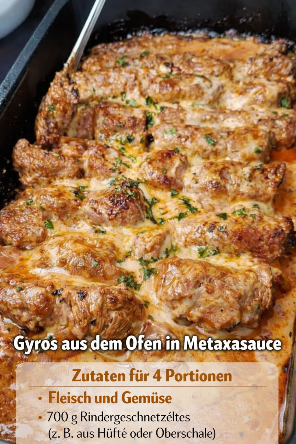Im hektischen Alltag sind Rezepte gefragt, die ohne großen Aufwand auskommen, aber trotzdem wie ein echtes Sonntagsessen schmecken. Genau hier spielt dieses Ofen-Gyros seine Stärke aus. Während das Fleisch in der Pfanne kurz angebraten wird, entfalten sich bereits die Röstaromen, die später in der cremigen Metaxasauce perfekt eingebettet werden. Die Sauce selbst ist harmonisch ausbalanciert: leicht fruchtig durch Tomatenmark, angenehm mild und cremig durch Crème fraîche oder Schmand und wunderbar rund im Geschmack. Durch das Überbacken im Ofen verbindet sich alles zu einer saftigen, goldgelben Köstlichkeit, bei der jede Gabel ein kleines Highlight ist.