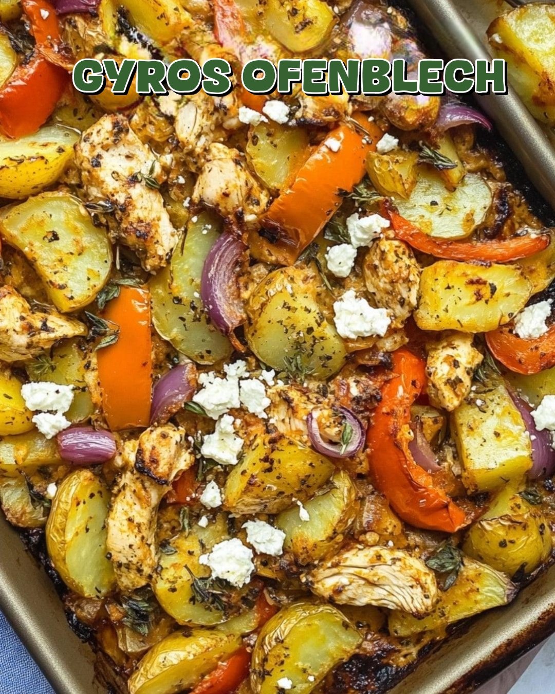 Finale im Ofen: Das Gyros-Ofenblech für weitere 20 Minuten backen, bis die Kartoffeln goldbraun und der Feta leicht gebräunt ist.