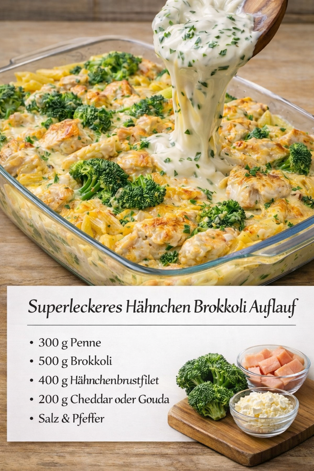 Nudeln, Brokkoli und Hähnchen in eine Auflaufform geben.