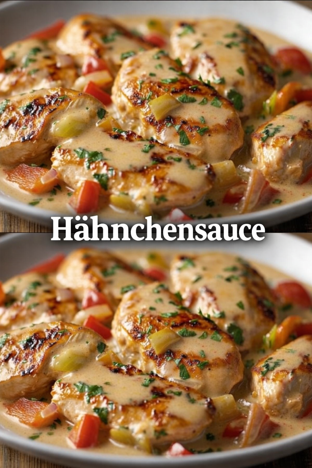 Sahne & Hähnchen hinzufügen: Die Sahne langsam einrühren, sodass eine cremige Sauce entsteht. Das angebratene Hähnchen zurück in die Pfanne geben und in die Sauce einbetten. Mit Salz und Pfeffer würzen.
