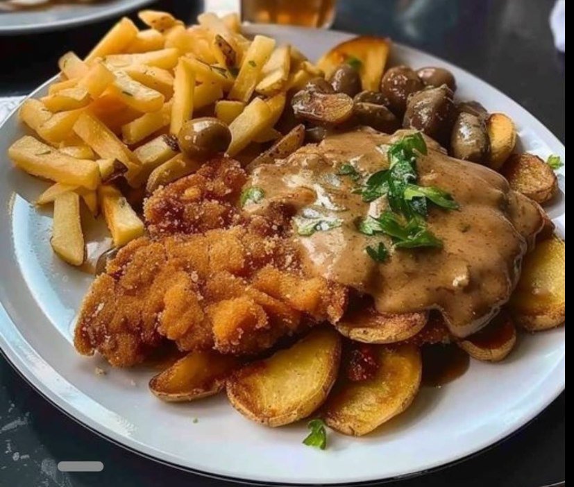 10. Die Schnitzel gen Teller legen, die Egerling-Rahmsoße darübergeben und mit den Pommes Frites servieren.