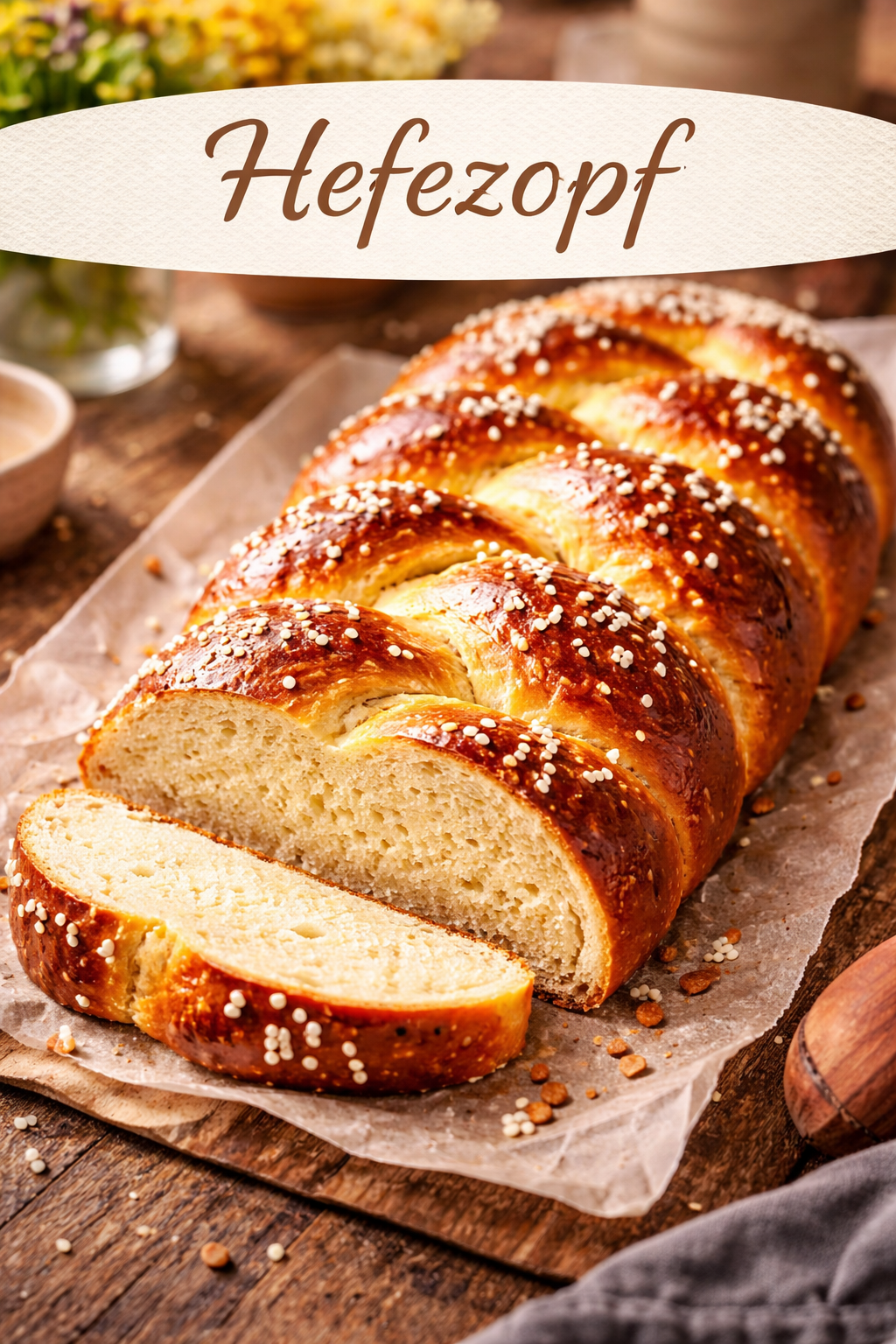 Der Hefezopf ist ein klassisches Gebäck aus der deutschen Backtradition und besonders beliebt zum Frühstück oder zum Nachmittagskaffee. Der weiche Hefeteig wird zu einem schönen Zopf geflochten und im Ofen goldbraun gebacken, wodurch er eine wunderbar lockere und luftige Konsistenz bekommt.