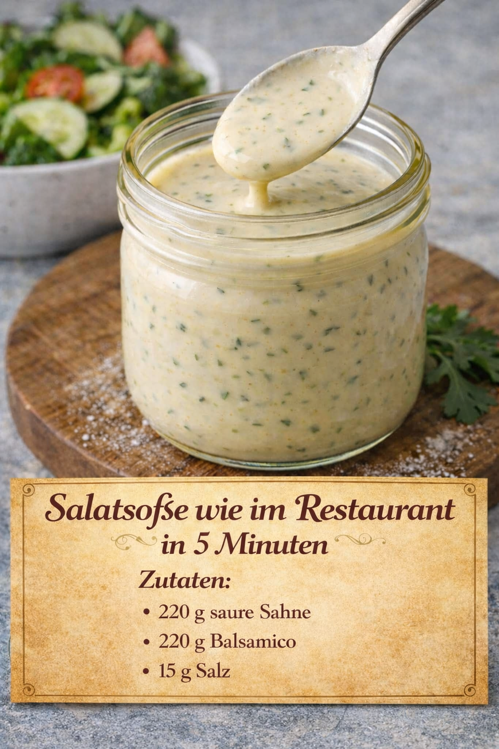 Diese Salatsoße schmeckt wie im Restaurant und ist in nur 5 Minuten fertig. Cremig, fein gewürzt und perfekt ausbalanciert. Mit wenigen Zutaten zauberst du ein Dressing, das jeden Salat veredelt. Ein echtes Blitz-Rezept für Alltag, Gäste und besondere Genussmomente. 🥗✨