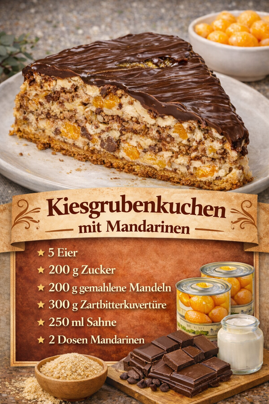 NUn die Sahne mit Sahnefestiger aufschlagen. Die zerkleinerten Kuchenbrösel und abgetropfte Dosenmandarinen unterheben.