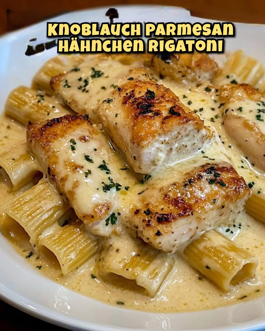 Alles kombinieren: Gebratene Hähnchenstücke und gekochte Rigatoni in die Pfanne zur Sauce geben. Gut vermischen, sodass alles gleichmäßig mit der Sauce bedeckt ist.