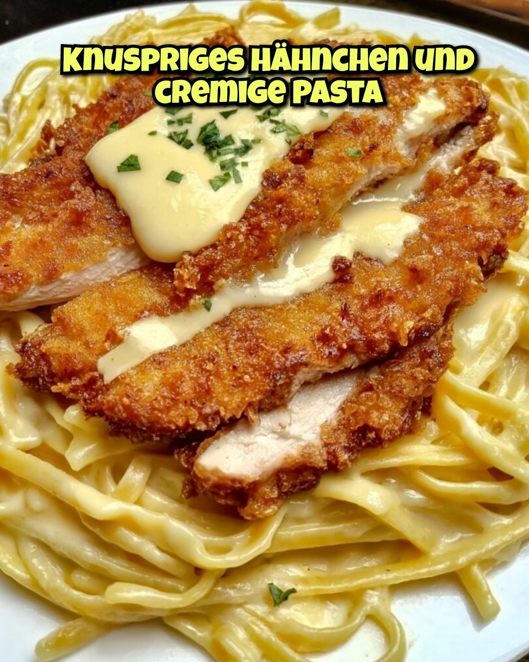 Die cremige Pasta auf Tellern anrichten und die knusprigen Hähnchenfilets darauflegen. Mit frischer Petersilie garnieren, wenn gewünscht.