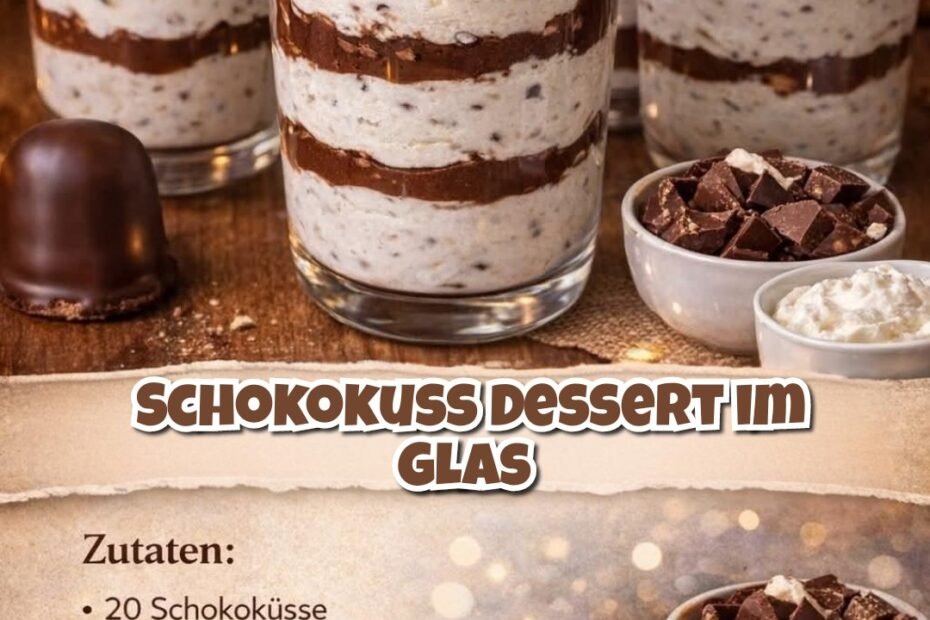 In Gläser schichten und mit einem Schokokuss dekorieren.