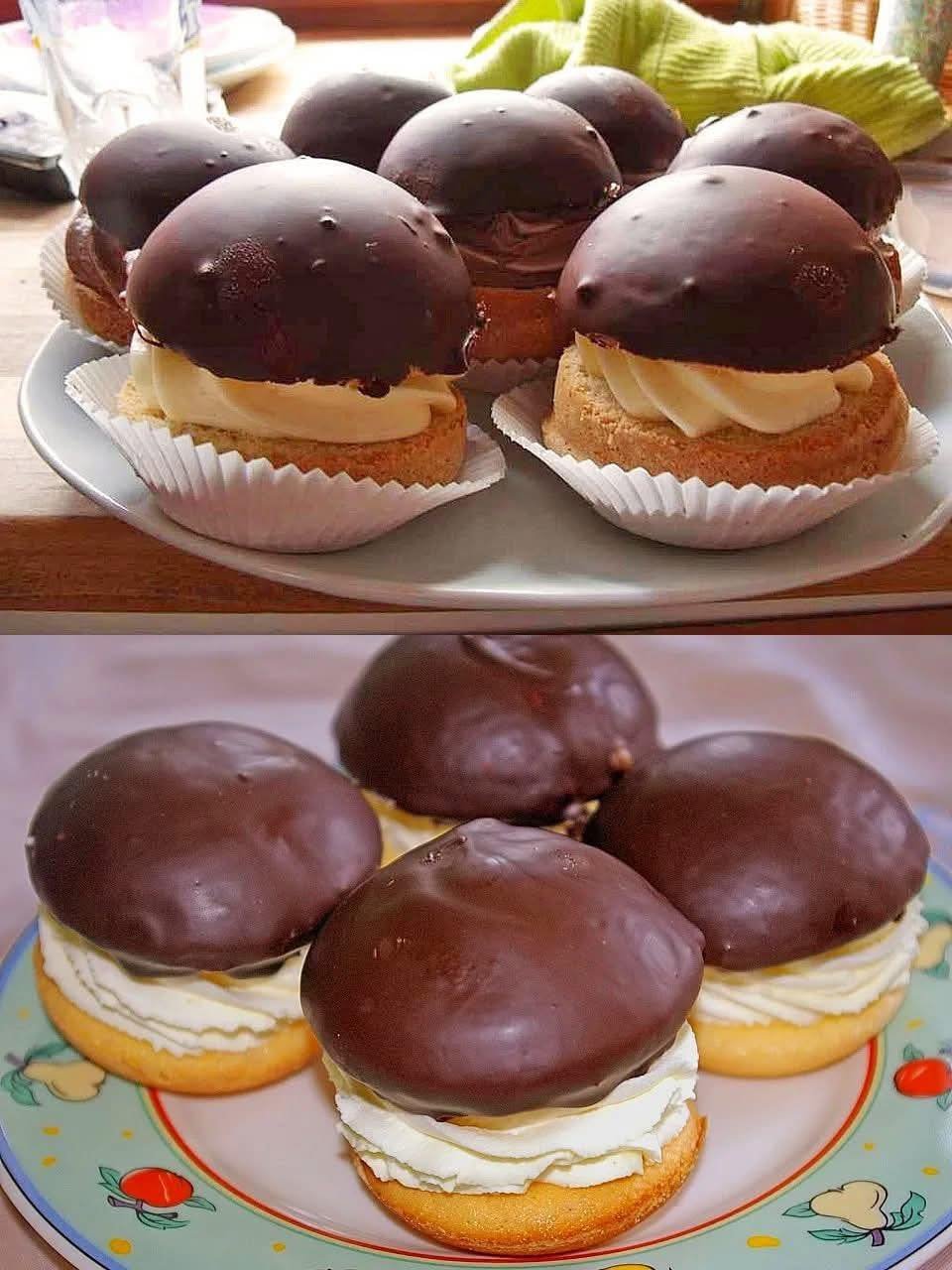 Die gekühlten Schaumhäubchen vorsichtig mit der Schokolade überziehen (oder eintauchen). Auf Backpapier setzen und im Kühlschrank fest werden lassen.
