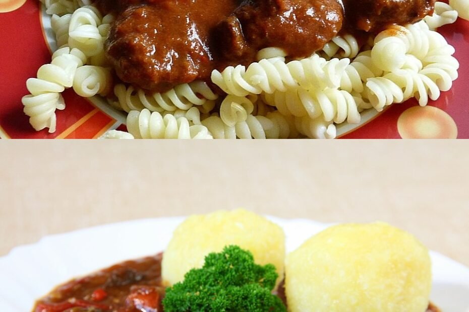 Zutaten 1 kg Gulasch vom Rind (Wadschinken ) 800 g Zwiebel(n) 4 Knoblauchzehe(n) 1 TL Kümmel, gehackt 1 EL Majoran 4 EL Paprikapulver 1 EL Essig Salz und Pfeffer 1 TL Tomatenmark Gutes Öl evtl.…