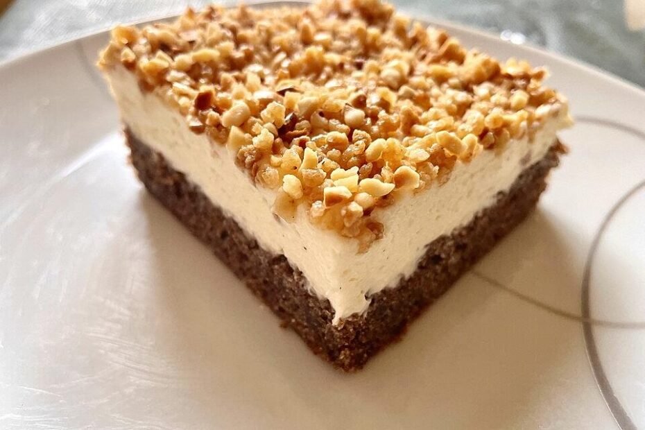 Zutaten 140 g Butter, weiche 100 g Zucker 5 Eigelb (Dotter) 10 g Backpulver 50 g Speisestärke 100 g Mehl 125 ml Sahne (Obers) Für den Belag: 5 Eiweiß 100 g Zucker 200 g Haselnüsse,…