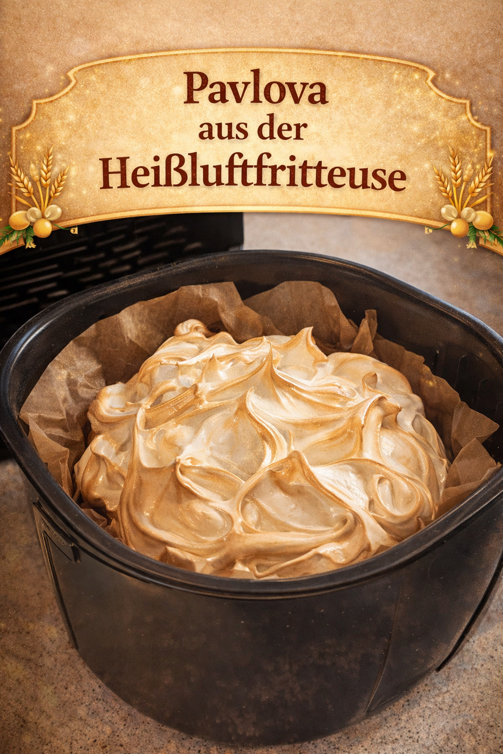 Gerade für alle, die keine Lust haben, den großen Backofen lange vorzuheizen oder die nur eine kleinere Menge zubereiten möchten, ist der Airfryer eine ideale Alternative. Die niedrige, gleichmäßige Temperatur sorgt dafür, dass das Baiser sanft trocknet, ohne zu bräunen, und innen seine charakteristische marshmallowartige Konsistenz behält. Das Ergebnis ist eine Pavlova, die außen fein knusprig und innen herrlich cremig ist – genau so, wie sie sein soll.
