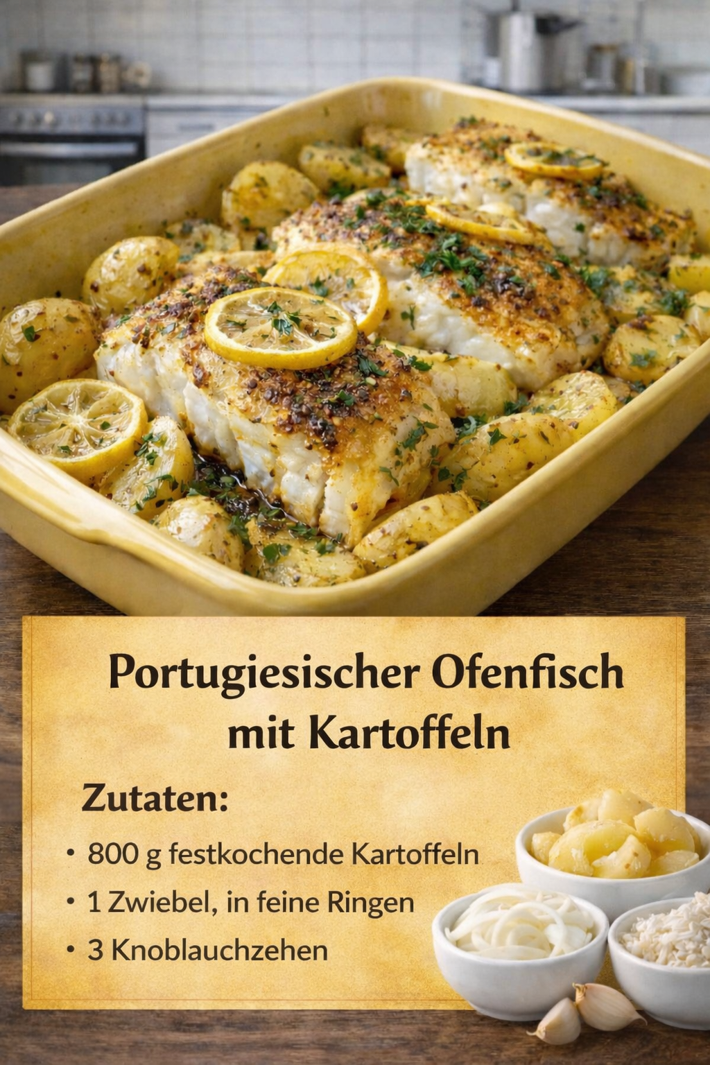 Im Ofen ca. 25–30 Minuten backen, bis der Fisch zart und die Kartoffeln goldbraun sind.
