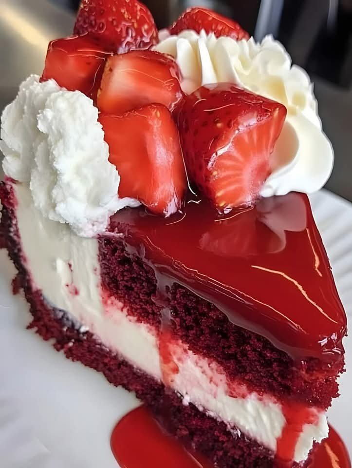 Vor dem Servieren weitere 1–2 Stunden kalt stellen. Genießen Sie diesen himmlischen Red Velvet Erdbeer-Käsekuchen!
