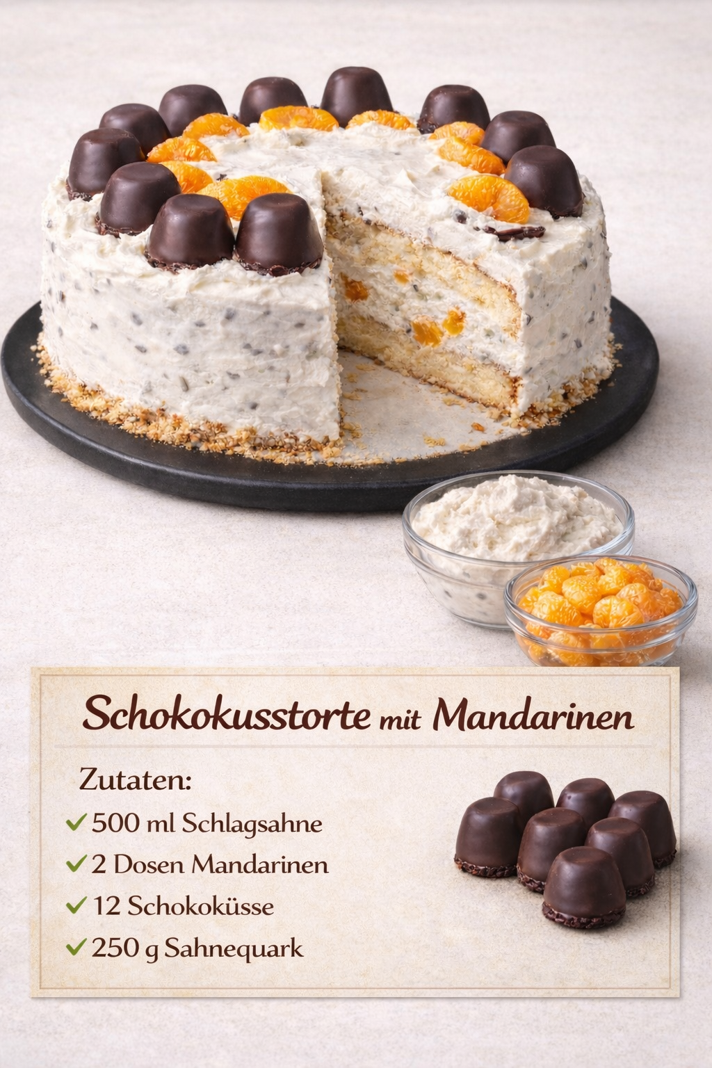 Mit halbierten Schokoküssen und Mandarinen dekorieren.