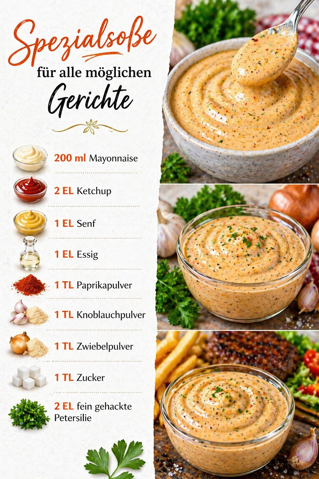 Diese Spezialsoße ist cremig, würzig und in wenigen Minuten fertig. Sie passt perfekt zu Pommes, Burgern, Fleisch, Sandwiches, Wraps, Gemüse, Grillgerichten oder als Dip für Snacks.