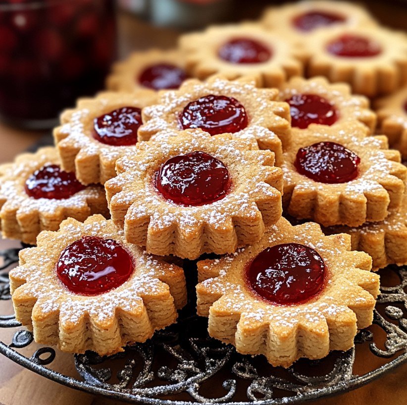Ringe mit Puderzucker bestäuben, vorsichtig auf die mit Konfitüre bestrichenen Kreise setzen und leicht andrücken.