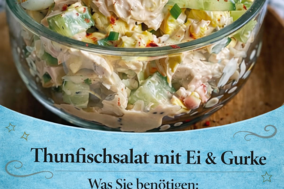 Thunfisch, Eier, Gurke und optional Zwiebel in eine Schüssel geben und vorsichtig vermengen.