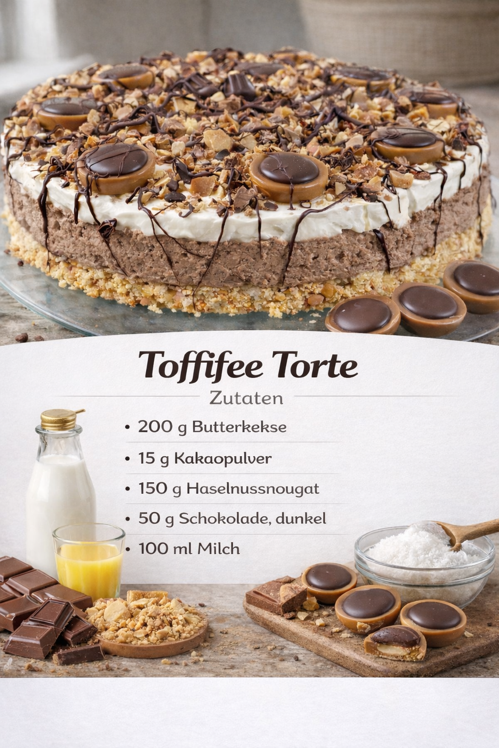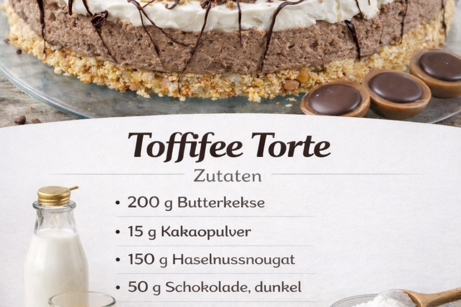 Auf die restliche Oberfläche die zerkleinerten Toffifee und die Nüsse geben. Danach vorsichtig den Tortenring abziehen.