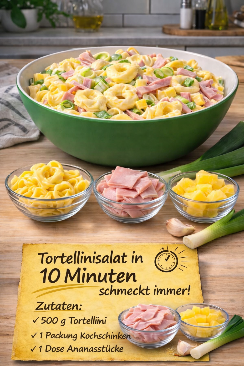 Tortellini, Schinken, Ananas und Frühlingszwiebeln in eine große Schüssel geben.