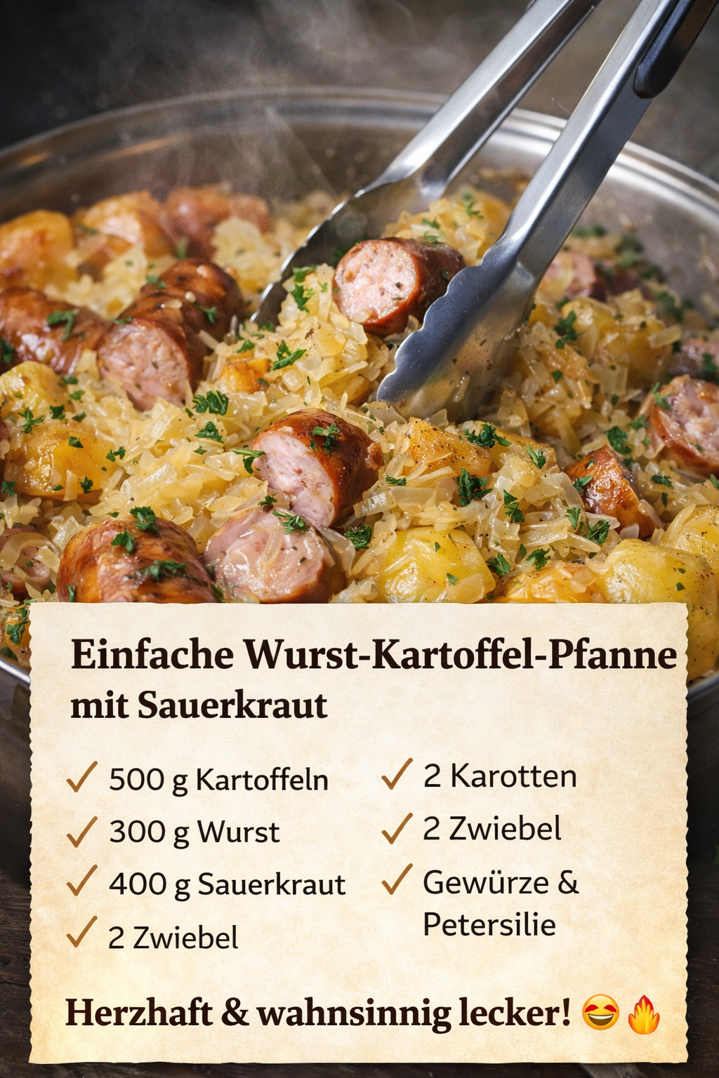 Dieses einfache und herzhafte Gericht erinnert an echte Hausmannskost – super für alle, die kräftige Aromen lieben. Die Kombination aus saftiger Wurst, zarten Kartoffeln und würzigem Sauerkraut ist einfach unschlagbar. Schnell gemacht und ideal für den Alltag!
