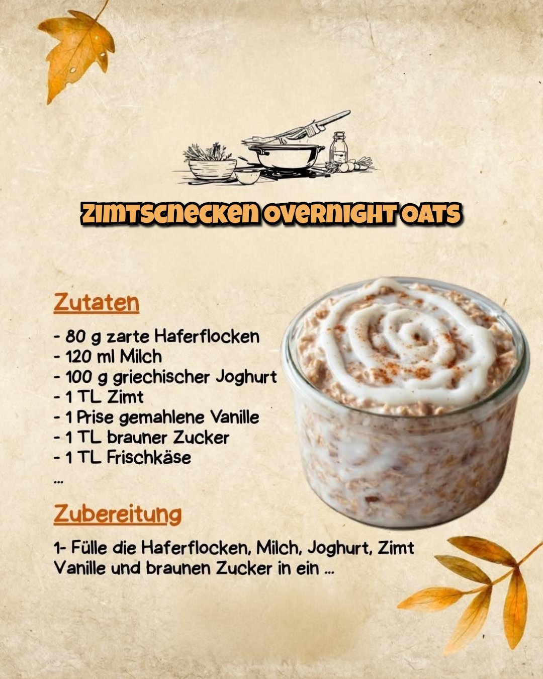 1- Fülle die Haferflocken, Milch, Joghurt, Zimt, Vanille und braunen Zucker in ein verschließbares Glas oder einen anderen verschließbaren Behälter. Verrühre die Mischung gut miteinander, verschließe den Behälter und stelle ihn für mindestens 3 Stunden, am besten aber über Nacht, in den Kühlschrank.